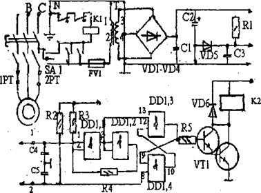 Результат выполнения конструкторской разработки. Принцип действия основан на фиксации изменения проводимостимежду корпусом наполняемого резервуара и двумя металлическими электродами. Анализирующая часть устройства выполнена на микросхемеКМОМ структуры, включающей в себя четыре элемента 2И-НЕ. Для питания устройства используется четырехпроводная сеть стремя фазами (А,Б,С) одним нулевым(n)проводами. Устройствосодержит элементы защиты электродвигателя насоса. Устройство работает в ручном и автоматическом режиме.Основной режим работы - автоматический. Переключательsa1 (схема 1) включает в работу блок питания,который подает +9 В и + 15 В на датчики уровня воды. В процессезаполнения резервуара вода достигает электрода верхнего уровня инасос прекращает работу. По мере потребления уровень водыпонижается, открывая датчик нижнего уровня воды, насос включается.