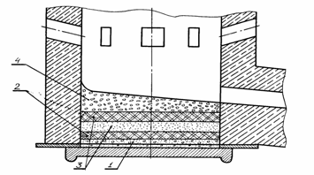 Описание Результат конструкторской разработки Теплоизоляционный поддон выгранки выполнен из четырех слоев. Первый слой 1(см. рис) состоит из горелой земли или отбросов, из искрогасителя толщиной 50...60 мм. На первом слое расположен слой 2 из свежей формовочной смеси толщиной 50...60 мм. Далее выполнен слой 3, состоящий из сухого песка толщиной 80...100 мм и формовочной смеси толщиной 100...120 мм. Верхний облицовочный слой 4 поддона выполнен из смеси дробленого природного минерала шунгита, электродной стружки с содержанием углерода до 65-80 % и борной кислоты. Все слои утрамбованы до получения плотного герметичного слоя. Шунгит состоит из 30-40 % углерода и 60-70 % кремнезема. Под действием высокой температуры углерод шунгита реагирует с кремнеземом, в результате чего в смеси появляется металлический кремний. Углерод и кремний являются сильнейшими восстановителями. При контакте жидкого металла и материала облицовочного слоя происходят процессы раскисления, науглероживания и модифицирования чугуна.