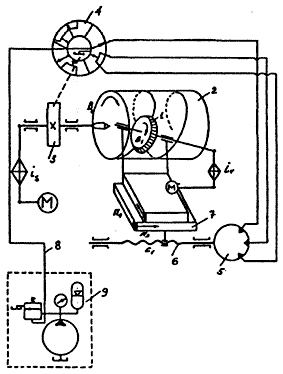 Описание Результат выполнения технологической разработки Гидравлическая цепь продольной подачи резьбофрезерного станка, включающая гидроцилиндр, связанный системой трубопроводов с узлами подачи заготовки и инструмента, дополнительно применяется гидравлический шаговый привод, состоящий из соединенных между собой системой трубопроводов генератора гидравлических импульсов, соединенного посредством приводного зубчатого колеса с приводом вращения заготовки и шагового гидродвигателя, осуществляющего через ходовой винт продольное перемещение суппурта с фрезерной головкой. На чертеже представлена схема гидравлической цепи продольных подач резьбофрезерного станка. Цепь включает в себя инструмент 1, заготовку 2, на шпинделе которой закреплено зубчатое колесо 3, от которого получает вращение золотниковая втулка генератора гидравлических импульсов 4, соединенного системой трубопроводов с гидравлическим шаговым двигателем 5, кинематически связанного с ходовым винтом б и осуществляющего продольное перемещение суппорта 7 с фрезерной головкой, при этом рабочая жидкость к генератору гидравлических импульсов подводится по трубопроводу 8 от насосной установки 9. Работа станка осуществляется следующим образом. Инструмент получает вращение от электродвигателя через звено настройкиi v. Заготовка вращается от электродвигателя через звено настройкиi s. На шпинделе заготовки закреплено зубчатое колесо 3, приводящее во вращение золотниковую втулку с расчетным числом щелей генератора гидравлических импульсов 4, соединенного системой трубопроводов с гидравлическим шаговым двигателем 5, кинематически связанного с ходовым винтом 6 продольной подачи узла инструмента 7.