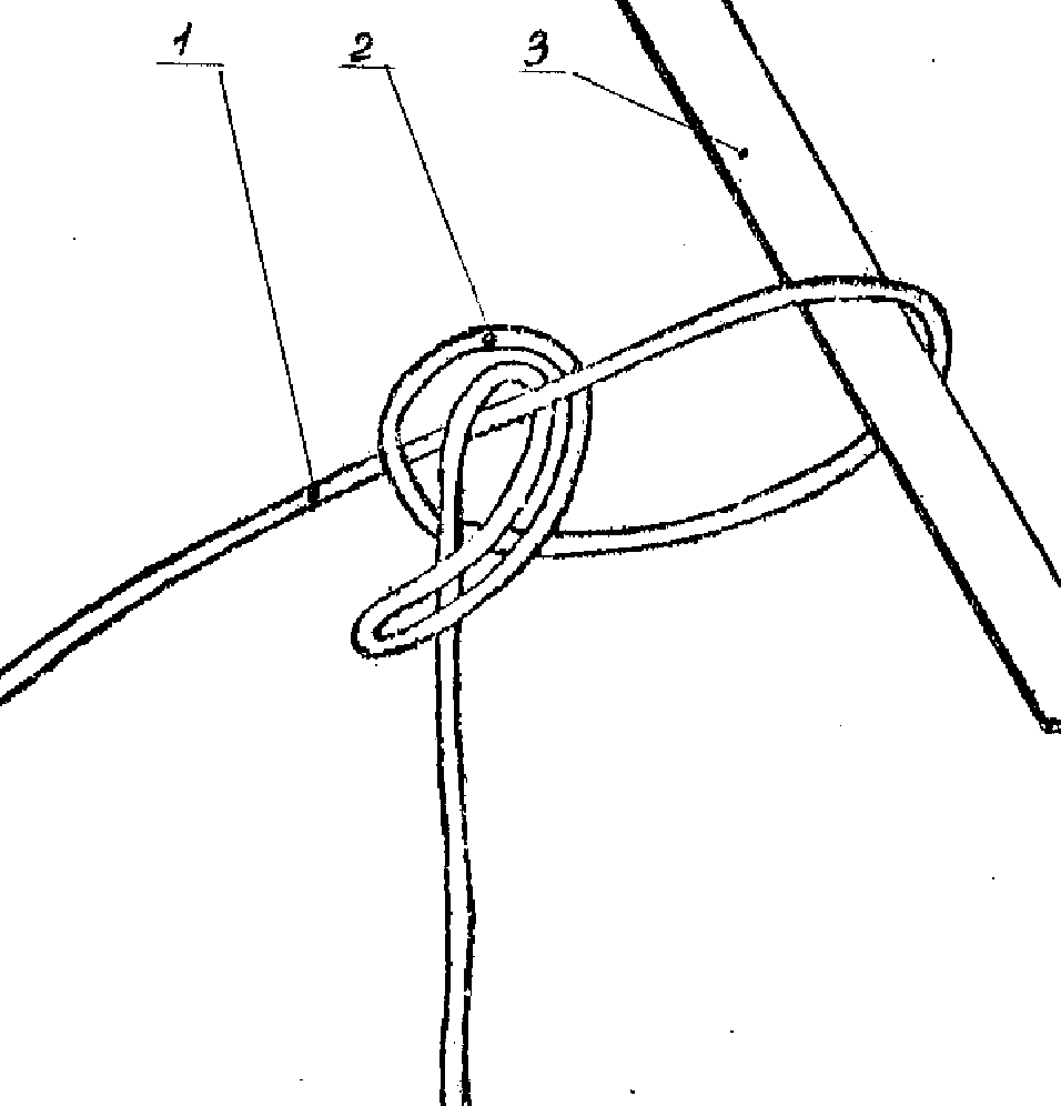 Описание к ИЛ 82-056-03 Частное техническое решение, имеющее самостоятельно значение. Ремонтные бригады электромонтеров работают часто в составе двух человек. В случае попадания одного из них под напряжение на опоре для снятия пострадавшего другим без посторонней помощи применяется устройство (см. рис. 1), состоящее из специальной веревки 9 и двух карабинов 3,5. К одному из карабинов привязан один конец веревки, а через второй карабин пропускается другой ее конец. Опускание пострадавшего электромонтера с опоры на землю производят в следующем порядке. Второй член бригады влезает на столб 8, карабин 3 закрепляет за крюк 2 изолятора, а карабин 5 закрепляет к монтерскому поясу4 пострадавшего. Затем, подтянув этого электромонтера выше, закрепляет специальную веревку к траверсе 10 опоры узлом 1. После этого необходимо отстегнуть цепь 6 пояса пострадавшего и выдернуть из столба когти 7, на которых он стоял. На рис. 2 показано формирование узла 2 для крепления специальной веревки 1 к траверсе 3 опоры. Зафиксировав пострадавшего на опоре с помощью описанного устройства, спасающий слен бригады сам спускается на землю, слегка дергает специальную веревку вниз (при этом развязывается узел)И, постепенно ослабляя веревку, опускает пострадавшего с опоры. После этого он немедленно оказывает ему первую помощь. |