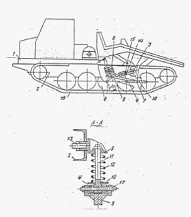 Результат выполнения конструкторской разработки. Серийно выпускаемые лесные машины на базе трактора ТТ-4М имеют полужесткую рычажно-балансирную подвеску. При наезде на неровность (пни, порубочные остатки и пр.) опорными катками задней каретки и при съезде с препятствия наблюдаются жесткие передачи возмущений (коэффициент динамичности увеличивается в несколько раз). Поэтому ограничиваются рабочие и транспортные скорости движения машины и, как следствие, снижается производительность. Усовершенствованная ходовая система включает остов 1 с продольными лонжеронами 2 коробчатого или швеллерного поперечного сечения. В отверстиях 3 лонжеронов 2 установлена поперечная балка, на концах которой шарнирно закреплены дополнительные рычаги 4, другой конец которых с помощью шарнира соединен с балансирным рычагом 5, который связан с опорным катком 6 и шарнирно с кареткой 7, несущей два других опорных катка. Упругая подвеска 8 установлена над балансирным рычагом 5 между кронштейном 9 рамы и подвижной опорой 10. Подвеска состоит из штока 11 и пружины 12. Шток при деформации пружины рычагом перемещается во втулке кронштейна 9, обеспечивая работу пружин без перекосов. Кронштейн 9 соединен с рамой при помощи оси 13. Дополнительный рычаг 4 выполнен телескопическим в виде пустотелого цилиндра 14 и поршня 15 с установленными между ними упругими элементами 16. Один конец дополнительного рычага крепится к поперечной оси, а другой шарнирно соединен с балансирным рычагом 5 посредством оси 17.