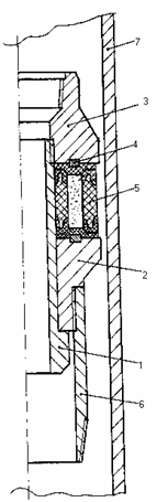 Пакер содержит корпус 1 (см. рисунок) с буртом в нижней части, на который (с посадкой на корпус) установлен нижний (ниппельный) упор 2. В верхней части корпуса на резьбе посажен верхний (муфтовый) упор 3. Между упорами 2 и 3, посредством двух цилиндрических центраторов 4, на корпус 1 посажен уплотнительный элемент 5. Нижний упор 2 имеет наружную резьбу, на которую навернут переводник 6, заканчивающийся конической (насосно-компрессорной) резьбой для связи с продолжением насосно-компрессорной трубы. Пакер размещен в скважине в обводной трубе 7 с определенным зазором. |