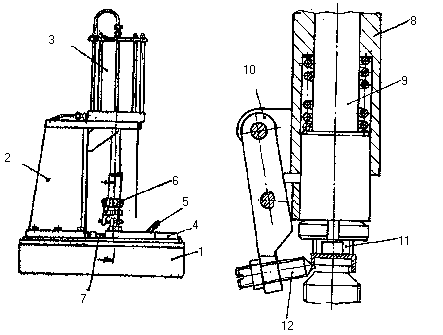 Работает приспособление следующим образом. Каретка выдвигается, устанавливаются детали, каретка подается в зону сборки. Поворачивают ручку пневматического крана влево, сжатый воздух от сети поступает в нештоковую полость цилиндра. Шток, передвигаясь вниз, через специальную гибочную головку передает усилие на собираемые детали, где происходит их подгибка с трех сторон нажимными винтами 12. После сборки детали поворотом ручки направо шток пневмоцилиндра возвращается в исходное положение. Каретку с деталью выдвигают из зоны сборки, цикл повторяется. |
