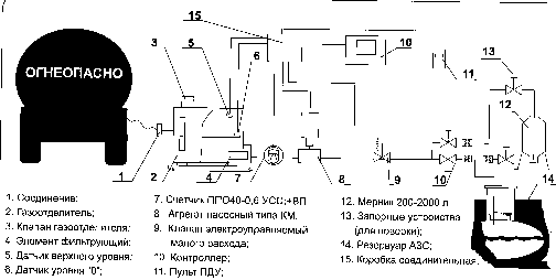 Результат выполнения конструкторской разработки. Комплекс для учета жидкости при сливе из автоцистерны (Рис. 1) состоит из: 1. Клапан отсекатель электроуправляемый с клапанами большого и малого расходов. 2. Клапан электроуправляемый воздушный. 3. Счетчик ППО 40-0,6УСС+ВП 4. Контроллер КУП 5. Газоотделитель с фильтром и датчиками уровня. 6. Агрегат насосный 7. Индикатор уровня «0» Комплекс имеет не большие габаритные размеры и установлен на салазках, поэтому легко перемещается с одного рабочего места на другое. Схема узла учета для приемки нефтепродукта на АЗС из автоцистерны