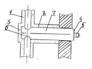Описание к ИЛ № 29-013-04 Результат выполнения конструкторско-технологической разработки. Циркуляционное устройство состоит (см. рис.) из наружного надземного трубопровода 1 и вводной трубы 2 с теплоизоляцией. Оба торца трубы перекрыты заглушками - наружной, глухой 3 и внутренней 4, причем последняя снабжена штуцером 5. По оси наружного трубопровода 1 и по вводной трубе просверлены отверстия 6, а вдоль трубы установлена диафрагма 7, примыкающая вплотную к глухой заглушке 3 и не доходящая до внутренней 4. Внутренняя заглушка имеет отверстие, выполненное соосно с отверстиями в вводной трубе. Устройство работает следующим образом. Вода из надземного наружного трубопровода поступает в отверстие вводной трубы и далее частично проходит через отверстие в продольной диафрагме в наружный трубопровод, а частично - по каналу, образованному цилиндрической поверхностью вводной трубы и продольной диафрагмой - на потребление в здание (при наличии водозабора) или на циркуляцию (при отсутствии водозабора). Кроме того, при диаметре наружного трубопровода, большем диаметра вводной трубы, вода частично проходит транзитом, минуя вводную трубу. При этом циркуляция воды во вводе обеспечивается за счет динамического напора у отверстия трубы со стороны набегающего потока жидкости и пониженного статического напора у отверстия с противоположной стороны трубы.