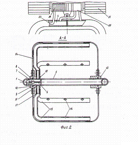 При тушении лесного пожара агрегат движется по трассе прокладываемой полосы, насос 20 выкачивает жидкость из емкости через рукав 15 и перфорацию 16 и направляет ее в пеногенератор 25, а освободившийся объем заполняется сжатым воздухом от компрессора 24. Жидкость с воздухом поступает на сетки пеногенератора, из которого выходит поток пены и на почве остается пенный валик, выполняющий функции опорной или заградительной полосы. Освободившаяся от жидкости емкость переводится навесным устройством трактора в транспортное положение, и агрегат вновь следует к месту заправки. Мягкая оболочка емкости обеспечивает в процессе работы агрегата сохранность живого напочвенного покрова, что особенно важно в условиях многолетней мерзлоты, где нанесенные ему повреждения ведут к необратимым экологическим последствиям. Сохранность оболочки емкости при ударах о стволы деревьев гарантируется трубчатой рамой. Рама, выполняющая функцию каналов, позволяет исключить наружное расположение магистралей и вероятность их повреждения, что повышает эксплуатационную надежность емкости. |