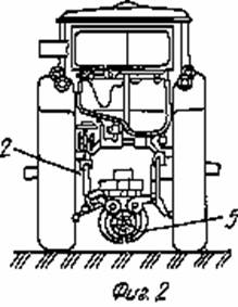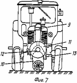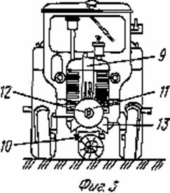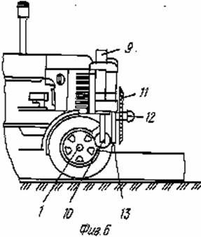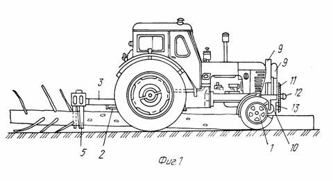Описание Результат выполнения конструкторской разработки. Сучкорезно-раскряжевочная трелевочная машина, включает самоходное шасси колесного или гусеничного трактора, на раме которого установлена кабина оператора, смонтированную на раме гидронавески продольную балку с захватным органом на конце, причем захватный орган имеет установленный в его верхней части полукольцевой нож, а с боковых сторон - зажимные рычаги с ножами для обрезки сучьев, приемную вилку и режущий орган, снабжена установленными на переднем брусе шасси телескопическими балками, на выдвижной секции одной из которых установлен подпружиненный ролик, а на выдвижной секции другой - режущий орган в виде дисковой пилы и приемная вилка, при этом дисковая пила снабжена приводом вращения в виде гидромотора. На фиг. 1 изображена сучкорезно-раскряжевочная трелевочная машина, вид сбоку; на фиг. 2 - вид машины сзади; на фиг. 3 - вид машины спереди с нажимным роликом и дисковой пилой; на фиг. 4 - захват для трелевки хлыстов и деревьев с ножами для обрезки сучьев, вид спереди; на фиг. 5 - захват для трелевки хлыстов и деревьев с ножами для обрезки сучьев, вид сбоку; на фиг. 6, 7 - виды увеличенного фрагмента машины - приемной вилки с дисковой пилой для раскряжевки хлыста на сортименты и нажимного ролика. Машина, включающая ходовое шасси 1 колесного или гусеничного трактора, снабжена на раме 2 гидронавески продольной балкой 3 на конце с захватным органом, снабженным в верхней части полукольцевым неподвижным ножом 4, с боков зажимными рычагами 5, снабженными ножами 6 для обрезки сучьев, причем зажимные рычаги имеют привод от гидроцилиндра 7 посредством тяги 8. На переднем брусе ходового шасси 1 закреплены телескопические балки 9, на выдвижных секциях одной закреплен подпружиненный ролик 10, а на другой - дисковая пила 11 с приводом вращения от гидромотора 12. При этом выдвижная секция, несущая дисковую пилу, снабжена приемной вилкой 13 для центрирования продольной оси комлевой части дерева относительно осевой продольной линии ходового шасси. Предлагаемая машина работает следующим образом. Машина въезжает (под пологом кроны) между деревьями задним ходом к комлевой части поваленного дерева и при наезде на него совмещает осевую продольную линию дерева с осевой линией самоходного шасси. С целью исключения уничтожения подроста и тонкомерных деревьев обрезку сучьев производят на месте его повала. Для этого наводят поворотную балку 3 с захватным органом и комлевую часть дерева охватывают зажимными рычагами 5 с ножами 6 и трелюют на разделочную площадку для раскряжевки. На разделочной площадке машина перемещается задним ходом вдоль оси дерева и обрезает сучья. С целью исключения перемещения дерева вдоль оси от усилий резания ножей при обрезке сучьев его центрируют вилкой 13 и прижимают роликом 10 к грунту. В результате увеличивается сопротивление дерева перемещению вдоль оси. Затем после обрезки сучьев и трелевки на разделочную площадку машина перемещается вперед на расстояния, равные длинам сортиментов или пиловочника, каждый раз останавливается, включает гидромотор 12 дисковой пилы 11 и с помощью выдвижной секции телескопической балки 9 производит раскряжевку хлыста на сортименты или пиловочник. Затем цикл повторяется: машина возвращается к очередному дереву, обрезает сучья и трелюет х