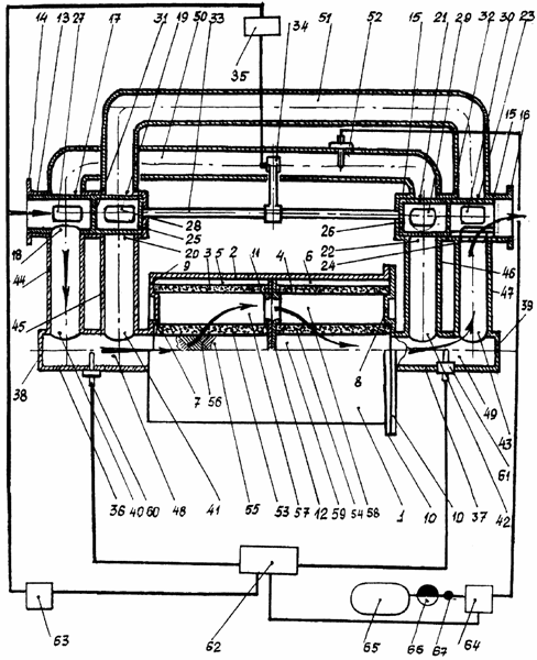 Описание Результат выполнения конструкторской разработки. Изобретение относится к машиностроению, а именно к двигателестроению, и может быть использовано для очистки отработавших газов двигателей внутреннего сгорания, в частности дизелей. Предлагаемое изобретение поясняется чертежом, на котором изображен продольный осевой разрез каталитического нейтрализатора отработавших газов двигателя внутреннего сгорания с регенерацией очистки, совмещенный со схемой автоматизации управления регенерацией. Здесь изображено положение, которое соответствует процессу очистки отработавших газов от вредных выбросов. Стрелками обозначено направление течения газов в каталитическом нейтрализаторе. Каталитический нейтрализатор отработавших газов двигателя внутреннего сгорания с регенерацией очистки содержит корпус 1 с внешними стальными 2 и внутренними металлокерамическими стенками 3 и 4, установленными с зазором 5 и 6 на выступах 7 и 8 торцевой стенки 9 и торцевой стенки 10, выступах 11 поперечной перегородки 12. Зазор 5 и зазор 6 являются теплоизоляцией. Входной патрубок 13 с фланцем 14 и выходной патрубок 15 с фланцем 16 выполнены в виде полых стаканов с отверстиями в днищах и с двумя парами окон 17 и 18, 19 и 20 в боковых стенках входного патрубка 13, окон 21 и 22, 23 и 24 в боковых стенках выходного патрубка 15. В патрубках 13 и 15 размещены поворотные стаканы 25 и 26 с окнами 27 и 28, 29 и 30 в боковых стенках. Поворотные стаканы 25, 26 имеют внутренние глухие поперечные перегородки 31 и 32, делящие поворотные стаканы на две полости. Поворотные стаканы 25, 26 жестко соединены через отверстия в днищах полых стаканов общим штоком 33, на штоке жестко закреплен поворотный рычаг 34 исполнительного механизма 35. Каталитический нейтрализатор оборудован связанными с его внутренней полостью впускной 36 и выпускной 37 трубами с глухими торцевыми поперечными стенками 38 и 39 соответственно. Окна 40 и 41 в боковых стенках впускной трубы 36 и окна 42 и 43 в боковых стенках выпускной трубы 37 не являются строго сориентированными относительно осей этих труб. Окнами 40 и 18 и соединительной трубой 44, окнами 41 и 20 и соединительной трубой 45 образованы соединительные каналы между входным патрубком 13 и впускной трубой 36; окнами 22 и 42 и соединительной трубой 46, окнами 24 и 43 и соединительной трубой 47 образованы соединительные каналы между выходным патрубком 15 и выпускной трубой 37. Боковыми внутренними стенками впускной трубы 36 и торцевой стенкой 38 образована впускная полость 48, а боковыми внутренними стенками выпускной трубы 37 и торцевой стенкой 39 образована выпускная полость 49. Коллектор 50 обратного движения отработавших газов расположен между окнами 17 и 21. Коллектор 51 прямого движения отработавших газов расположен между окнами 19 и 23. В коллектор 50 введена форсунка 52 для впрыска регенерирующих жидкостей или растворов. Впускная труба 36 связана через соединительные трубы 44 и 45 с окнами 17 и 18, 19 и 20 входного патрубка 13 и подключена через окно 27 в поворотном стакане 25 к коллектору 50 обратного движения отработавших газов, а через окно 28 в поворотном стакане 25 - к коллектору 51 прямого движения отработавших газов. Выпускная труба 37 связана через соединительные трубы 46 и 47 с окнами 21 и 22, 23 и 24 выходного патрубка 15 и подключена через окно 29 в поворотном стакане 26 к коллектору 50 обратного движения отработавших г