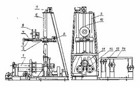 Устройство (рис.1) состоит из: узла 6 наладки диаметра и шага навиваемого змеевика и механизма 14 поддержки заготовки - трубы. Узел наладки устанавливается над листогибочной машиной 1, а механизм поддержки с ее боковой стороны. На валиках машины монтируются три рабочих ролика: прижимной 11 - на верхний вал и два тянущих 12 - на боковые валы. Качающийся ролик 5 установлен на каретке 2. Настройка на диаметр и шаг змеевика производится с помощью приводов 7 и 8 и винтов 3 и 10. Перемещение каретки в горизонтальном и вертикальном направлениях осуществляется по направляющим скалкам 4 и 9. Устройство для навивки змеевика Труба-заготовка, проходя через тянущие ролики и изгибаясь под прижимным роликом, перемещается вверх, где подхватывается качающимся роликом, который поддерживает виток змеевика и формирует его шаг. |
