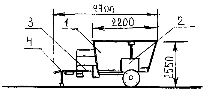 Результат технологической разработки. На рисунке 1 представлен общий вид агрегата. Он состоит из бункера 1, выгрузного окна 2, площадки 3 для обслуживающего персонала, привода рабочего органа 4. Принцип работы: загрузка исходного продукта осуществляется сверху в смесительную камеру овальной формы. Сразу же после загрузки шнек перемешивает корм в вертикальном направлении. Агрегат работает от вала отбора мощности трактора класса Внедрение технологии позволяет снизить затраты на приготовление кормов, повысить поедаемость кормов и продуктивность животных.