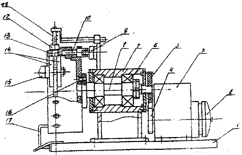 Результат конструкторской разработки. Приспособление устанавливают на фрезерном станке. Оно состоит (см. рисунок) из электродвигателя 2, установленного на плите 1, редуктора 3. От электродвигателя через клиноременную передачу, редуктор, шестеренки 4,5 вращение передается на вал 8, который смонтирован в корпусе 7 на подшипниках качения 6. На конце вала винтами 16 жестко крепится рабочий барабан 13. В барабане рассверлены двенадцать гнезд, в которые поочередно закладывают обрабатываемые детали. Фрезерование лысок производится одновременно с двух сторон винта двумя фрезами 14, закрепленными в оправке 15 шпинделя фрезерного станка. Для предотвращения проворачивания и жесткого зажима винта в гнезде в зоне фрезерования имеются верхний и боковой прижимы. Верхний прижим осуществляется пружиной 11, действующей на прижимную колодку 12. Боковой прижим винта осуществляется толкателем 10, который при набегании на копир 9 воздействует на головку винта в зоне фрезерования. При выходе из зоны фрезерования винты под собственным весом или же при заходе под планку 17 выталкиваются из гнезда и по лотку собираются в тару. |